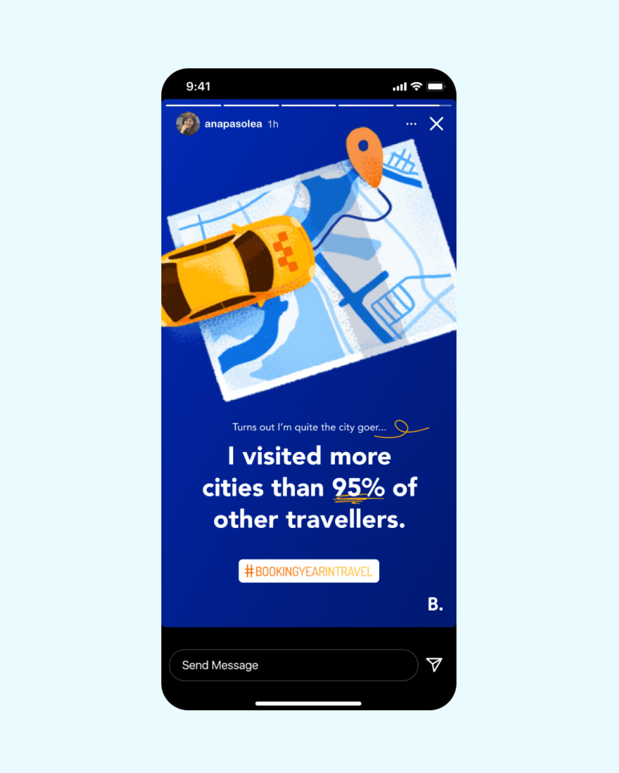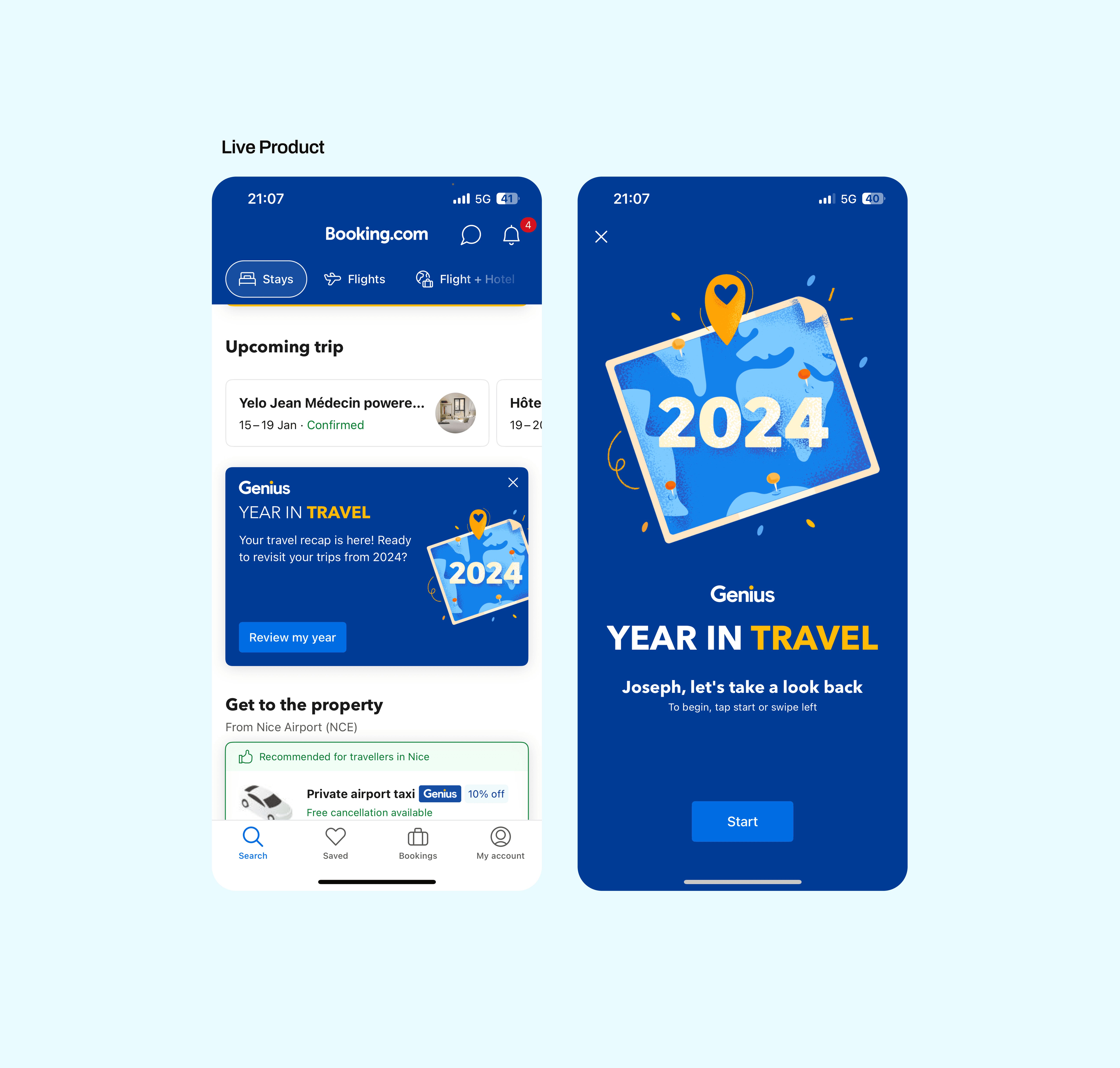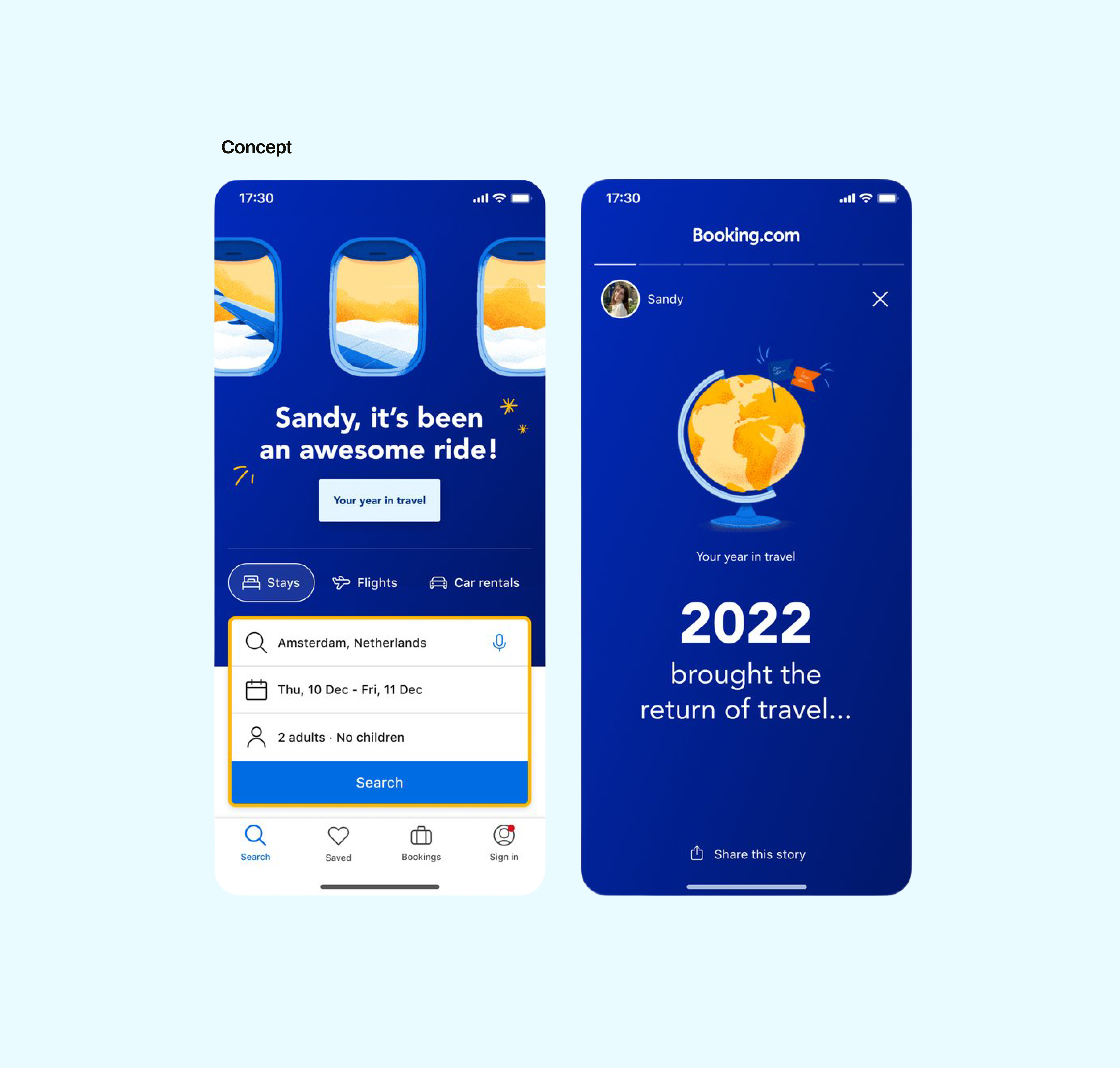 Concept, design and launch a personalised year-in-review experience for Booking.com users, giving them a shareable summary of their travel year in a format that felt native to how people consume and share content.