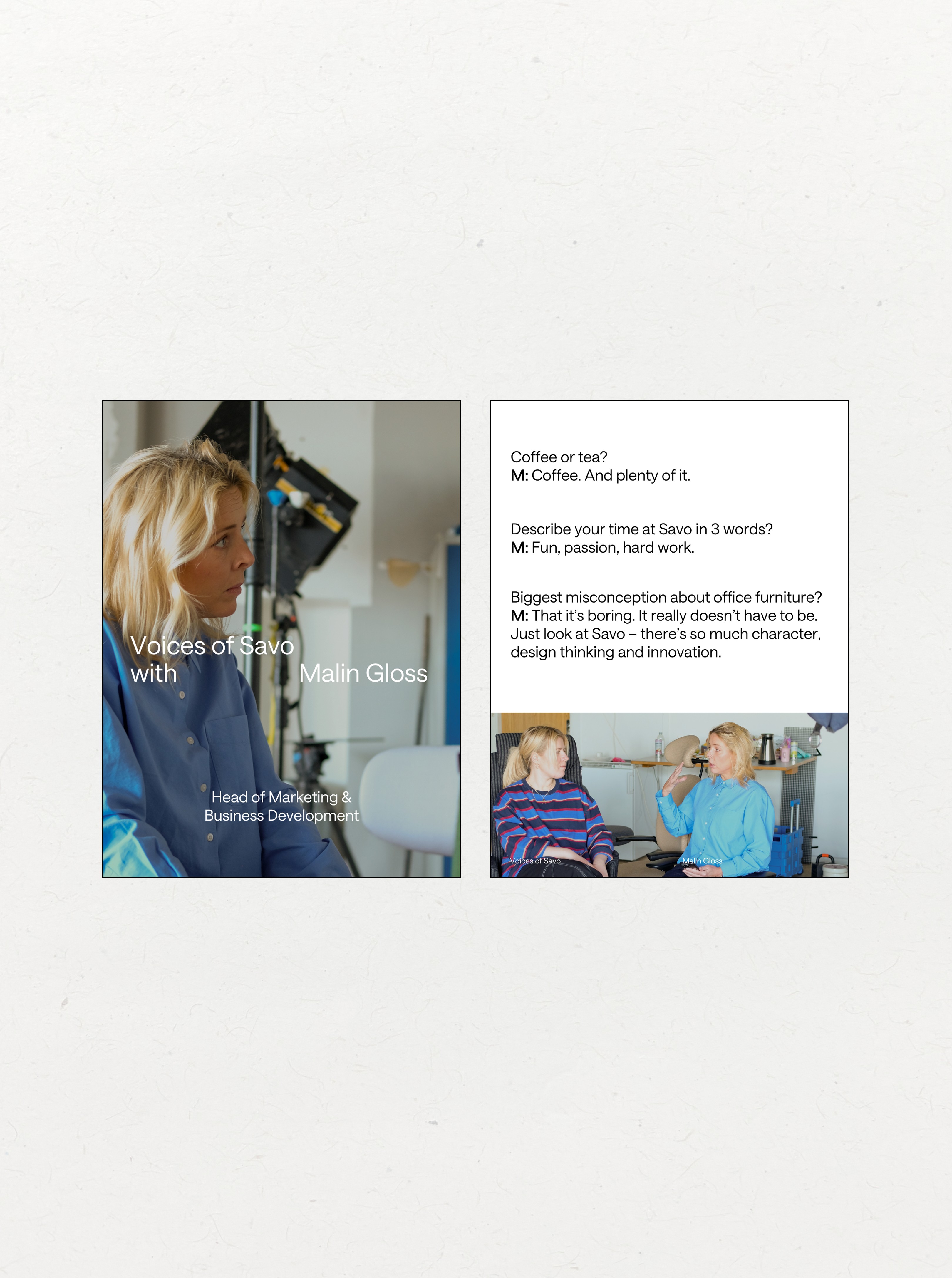 I shot on Fuji film and disposable cameras to achieve an analogue aesthetic, while using iPhone for quick behind-the-scenes story captures. Beyond the initial brief, I repurposed the captured content to create additional marketing materials, including an interview feature with Malin Gloss from Savo's marketing team (image 8) and product photography highlighting their anniversary publication (image 9).