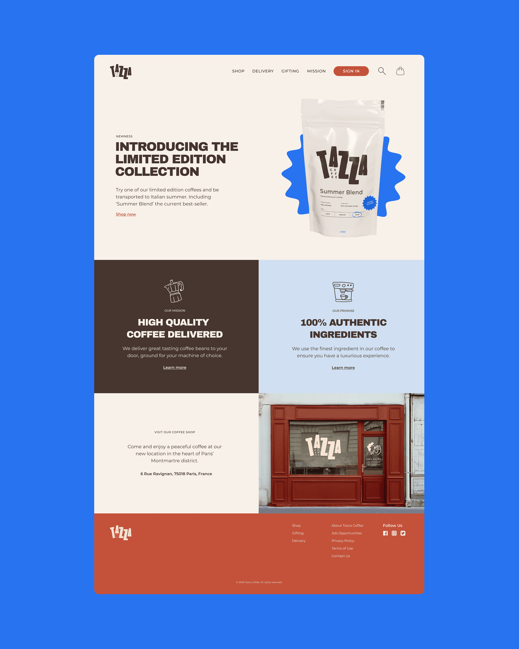 The coffee market is saturated with either stripped-back Scandinavian minimalism or heavy-handed Italian heritage clichés. Tazza needed to feel authentically Italian and genuinely contemporary at the same time, without falling into either.